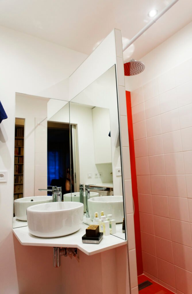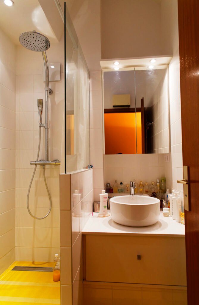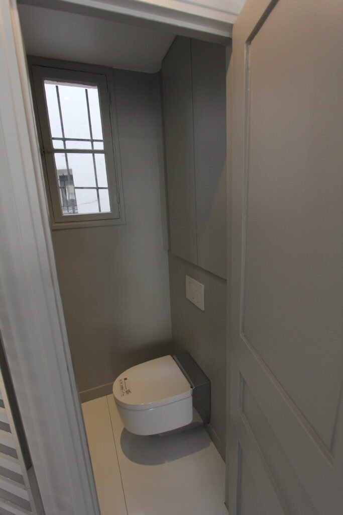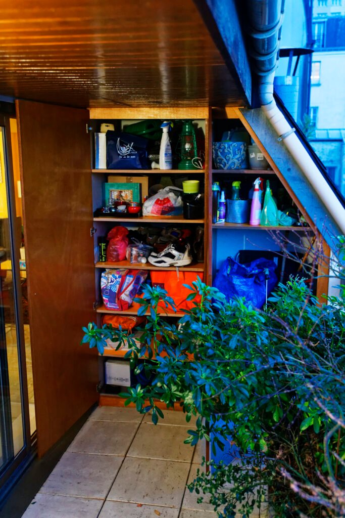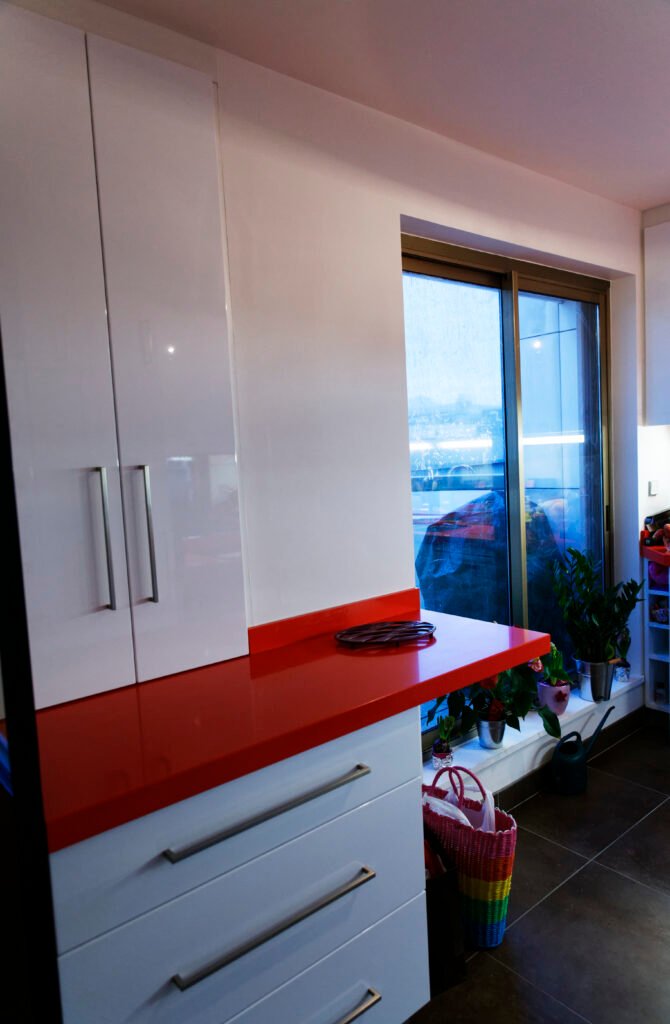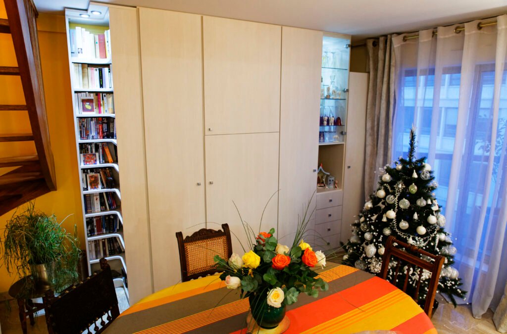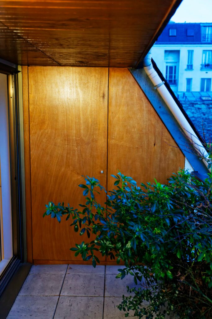 Une rénovation qui ose la couleur, utilisant des touches vibrantes de jaune et de rouge pour dynamiser les salles de bains et les vitrines sur mesure. L’expertise technique s’exprime particulièrement sur le balcon, avec la création ex nihilo d’un placard d’extérieur en bois massif, ajusté au millimètre sous la pente complexe du toit.
