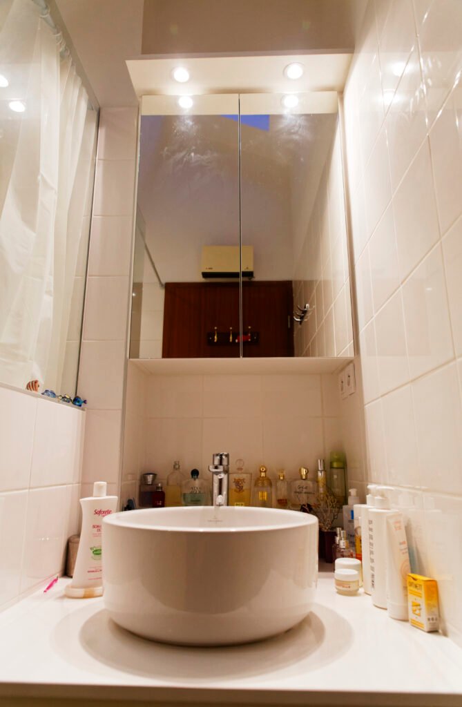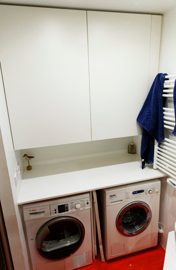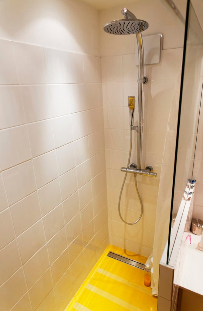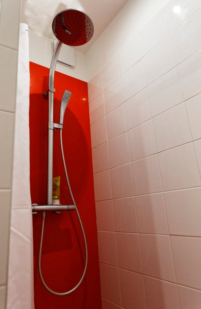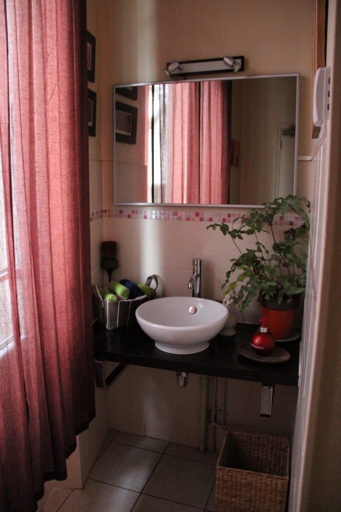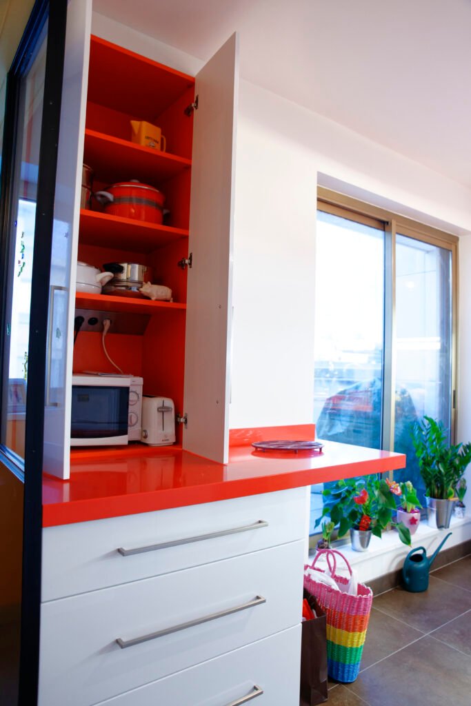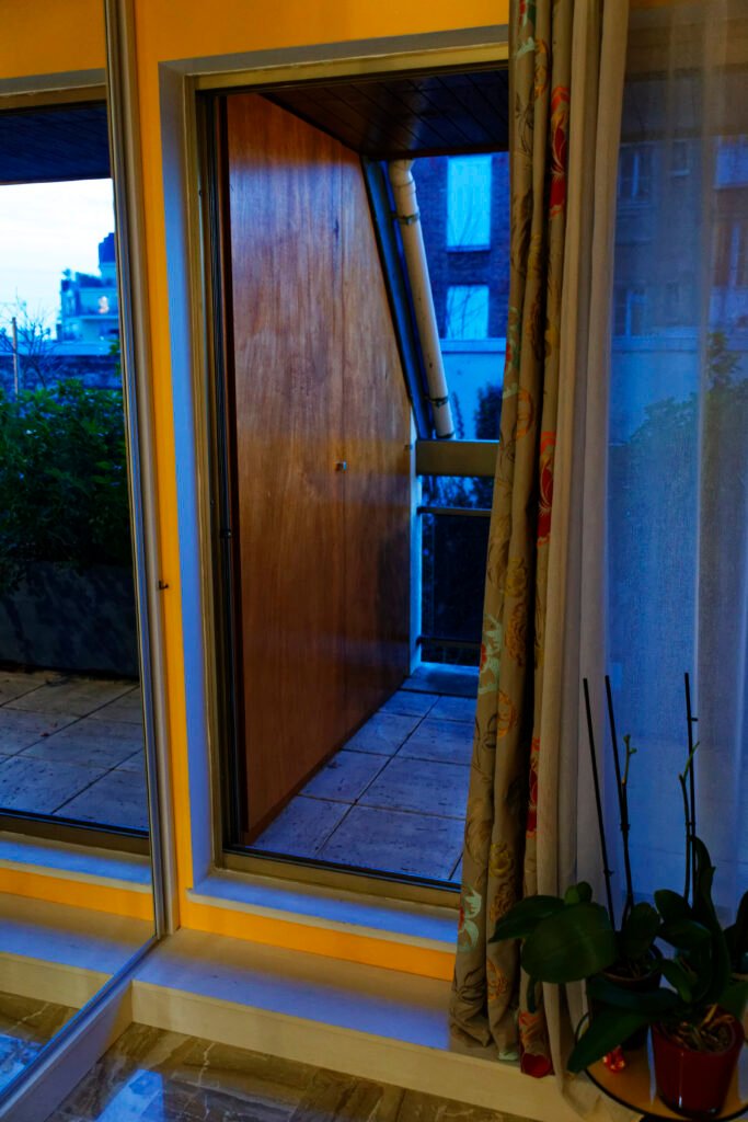 Une rénovation qui ose la couleur, utilisant des touches vibrantes de jaune et de rouge pour dynamiser les salles de bains et les vitrines sur mesure. L’expertise technique s’exprime particulièrement sur le balcon, avec la création ex nihilo d’un placard d’extérieur en bois massif, ajusté au millimètre sous la pente complexe du toit.