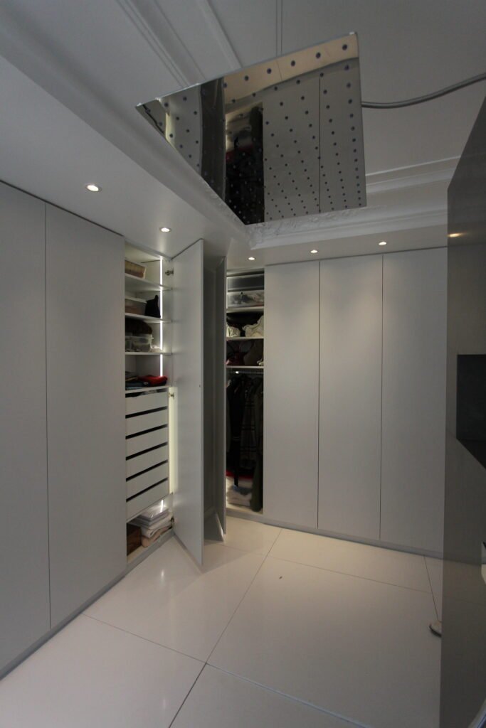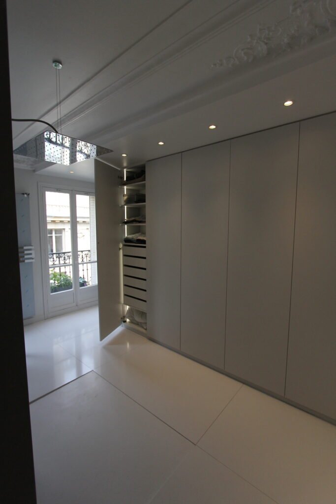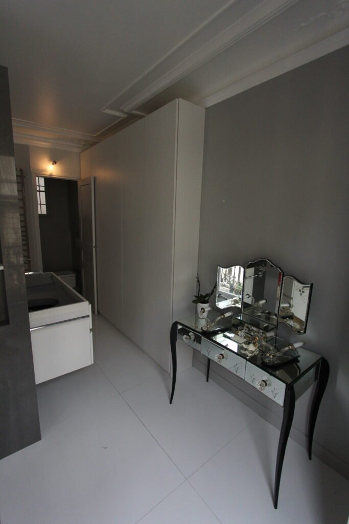 Ambiance graphique et contemporaine pour cet intérieur décliné en gris et noir. L’espace est structuré par des menuiseries sur mesure omniprésentes, intégrant des rangements muraux invisibles, un dressing spectaculaire et une salle d’eau au volume hors normes.
