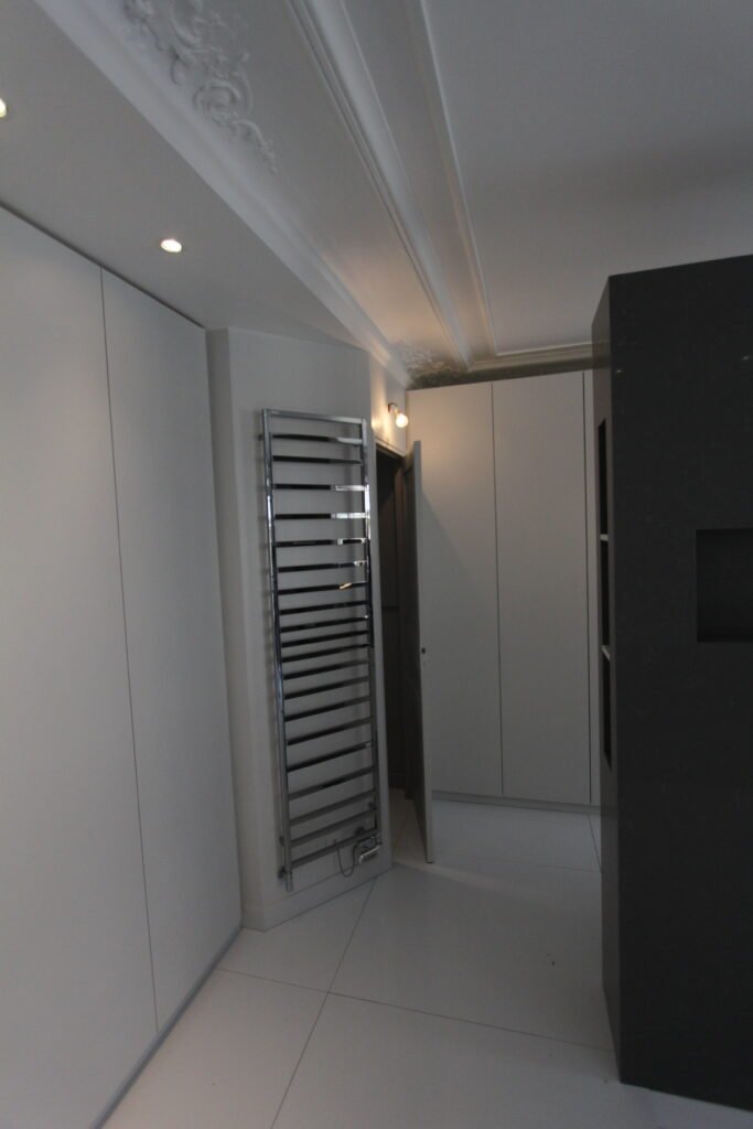 Rénovation complète où le blanc pur domine pour maximiser la sensation d’espace, de la cuisine minimaliste aux linéaires de rangements sur mesure. L’architecture intérieure est réchauffée par l’intégration de gorges lumineuses à l’éclairage chaud (jaune), qui viennent souligner les volumes et créer une atmosphère apaisante.